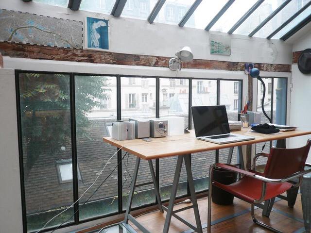 Atelier d’artiste donnant sur la cour d’une copropriété classée pleine de charme avec pavés, fleurs, briques et terrasses partagées, un cadre exceptionnel à 2 pas de la place Denfert Rochereau.