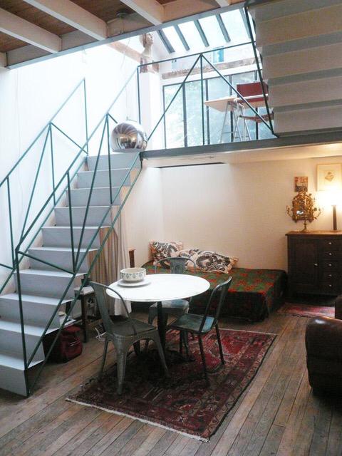 Calme et très lumineux, l’appartement est au 1er étage, et se compose au 1er niveau d’un séjour et d’une cuisine, puis un bureau sur le palier intermédiaire, et en haut, de la chambre, des rangements et de la salle de bains.